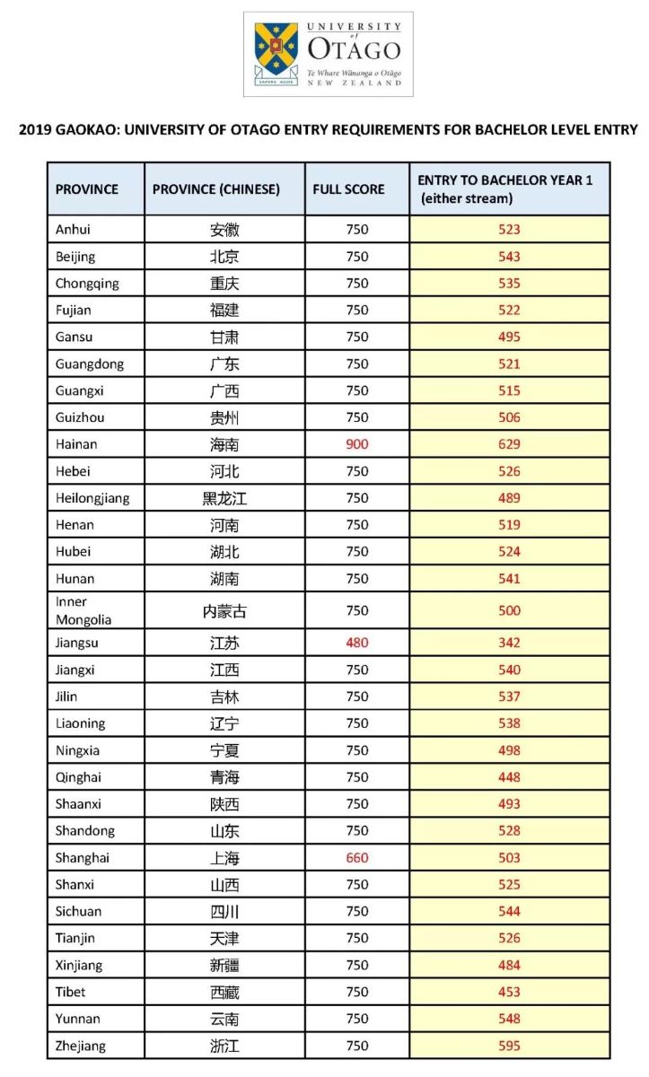 奧塔哥大學要求申請人的高考成績達到所在省份指定的一本分數線,想要申請的同學可以參考一下2019年奧塔哥大學的高考錄取分數線,了解一下申請奧塔哥大學本科課程需要達到多少分。