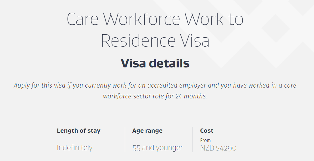 步驟2:工作滿2年后,申請人時薪達到28.25紐幣(行業薪酬標準Level 4),可以申請Care Workforce Work to Residence Visa。獲得居民簽證移民。
