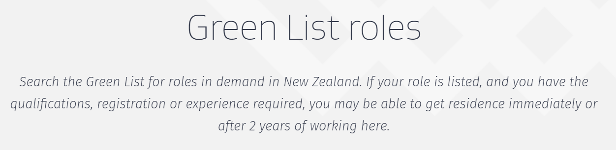 移民局官網上的信息是“Search the Green List for roles in demand in New Zealand. If your role is listed, and you have the qualifications, registration or experience required, you may be able to get residence immediately or after 2 years of working here.”,簡單說就是如果你的職業在綠色清單中,并且滿足所需要的資格、注冊或經驗,你可以立即獲得居民簽證 或 在新西蘭工作2年后獲得居民簽證。