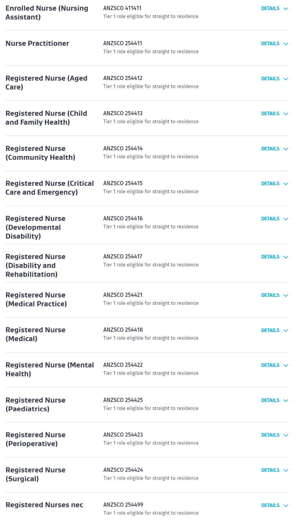 新西蘭綠色清單中的所有醫療行業職業已經全部納入直接申請居留簽證(Straight to Residence Visa),包括三類護理資格: